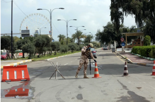 3月18日,在伊拉克巴格达,一名伊拉克安全人员走在空荡的街头。新华社发