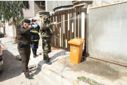 3月8日,在伊拉克北部基尔库克省,医疗人员为新冠肺炎确诊病例所在家庭的房屋消毒。新华社发